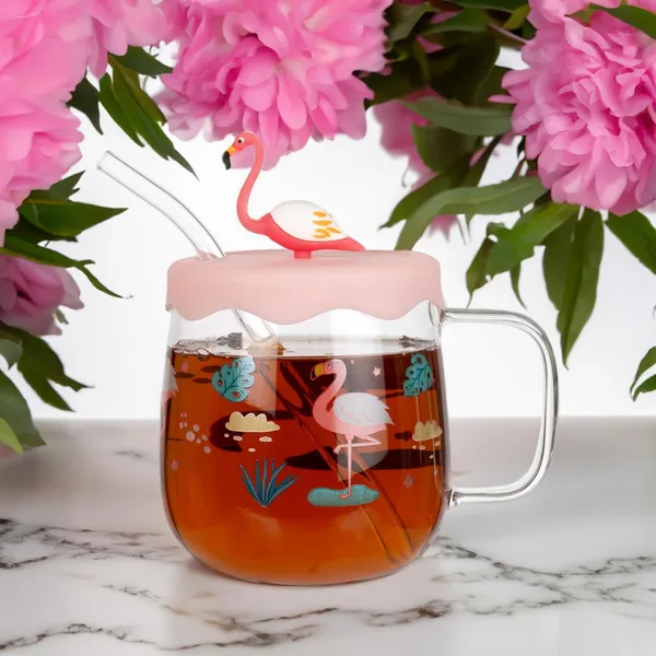 Flamingo Printed Glass Milk Cups With Silicone Lid And Straw Pack Of 1Morni..More